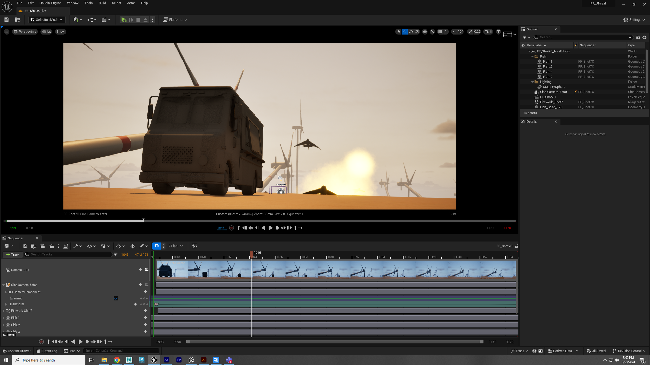 The workflow for this project revolved around a lot bouncing between maya and and unreal with doing most of the initial animation in maya and then importing the rig or caching the geometry into unreal. For majority of the modeling it was download from various sources, each requiring there own level of fine tuning. For texturing and lighting was down by me using substance painter. At the start of this project I didn’t have a lot of experience using Unreal at the time and I still feel like there is more to learn and I lot more skills I can push. I would love one day to take this previs to completion.